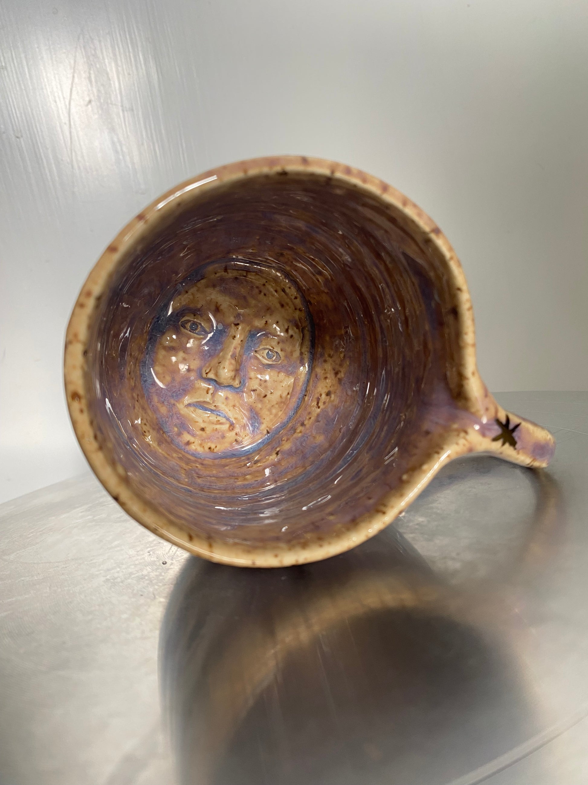 This handmade mug is inspired by the moon, with a slightly wonky shape that gives it a unique, organic feel. Glazed in soft, moon-like tones, it hides a face at the bottom inside—revealed only when you finish your drink. Simple, strange, and full of character, it’s perfect for anyone who enjoys the charm of handmade ceramics. Whimsical, strange, and full of personality, it’s a piece made for moonwatchers, night thinkers, and lovers of the unusual.