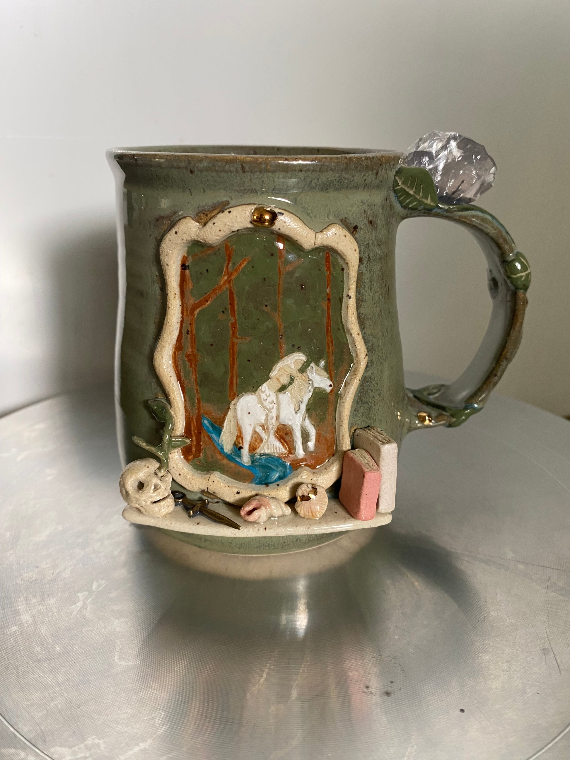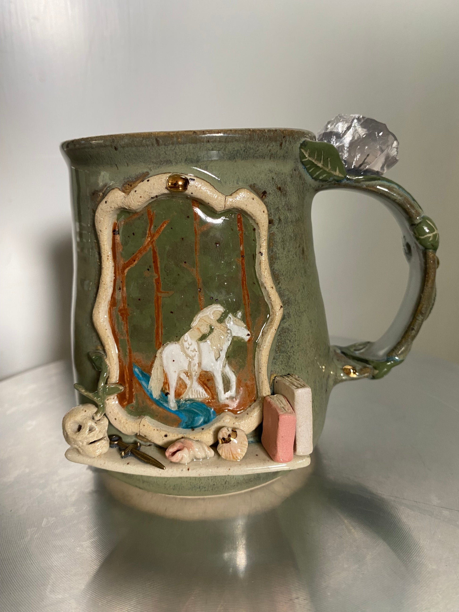 This handmade porcelain mug was shaped and finished over many hours, with careful attention to detail. It depicts a siren riding a kelpie through an enchanted forest, searching for the ocean she calls home. The siren is a creature of song and saltwater. The kelpie, a water spirit from Celtic folklore, is known for its shifting form and deep connection to rivers and lakes. Together, they travel through tangled woods touched by magic.